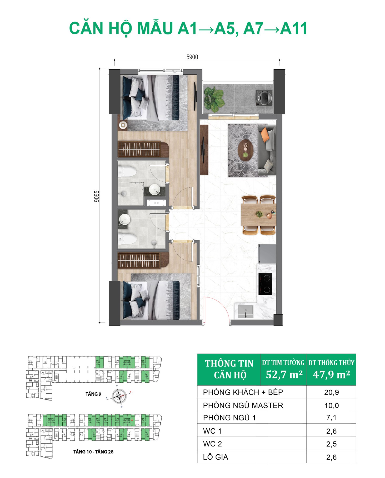 Căn 2PN thường 52m2 – 54m2 – 55m2 – 62m2