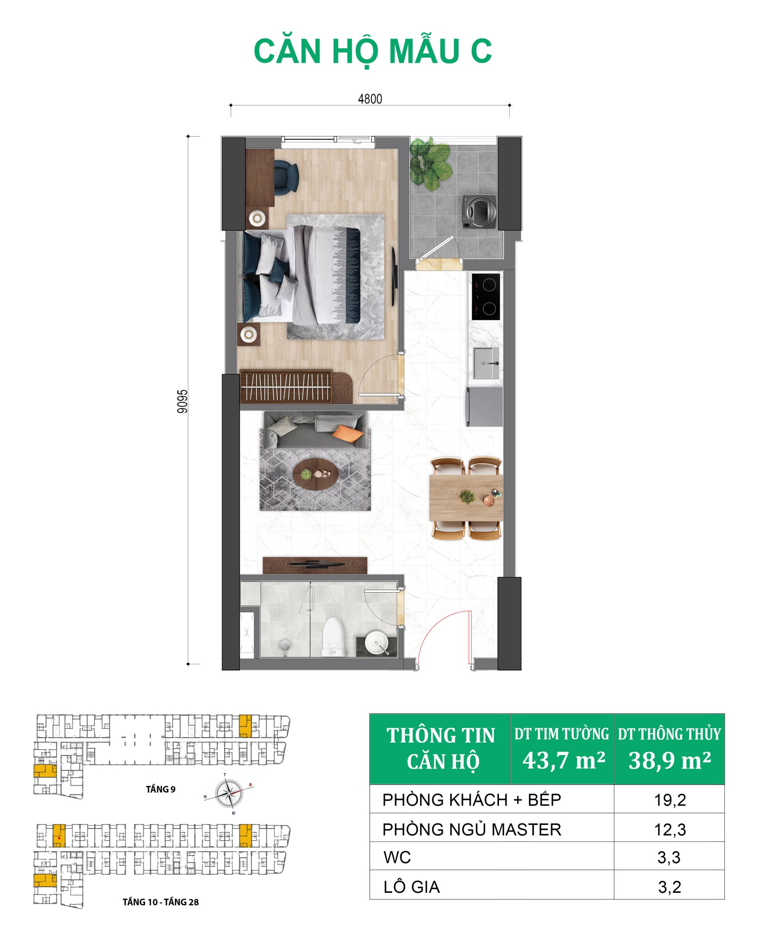 Thiết kế tối ưu với diện tích linh hoạt từ 33 – 56m2, đáp ứng nhu cầu an cư của các gia đình trẻ từ 1 – 2 phòng ngủ vừa tầm.