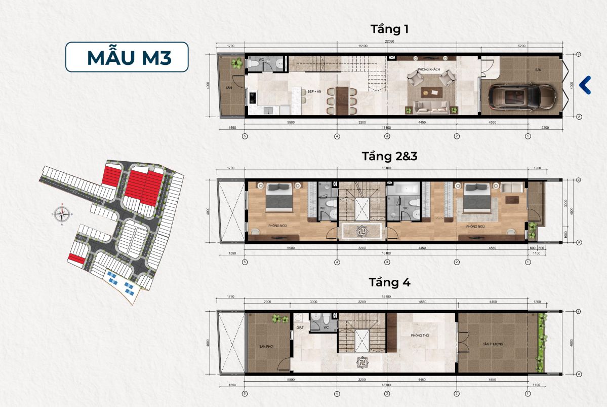 • Loại thiết kế: 1 trệt + 2 lầu + 1 tum thang (không sử dụng hầm)